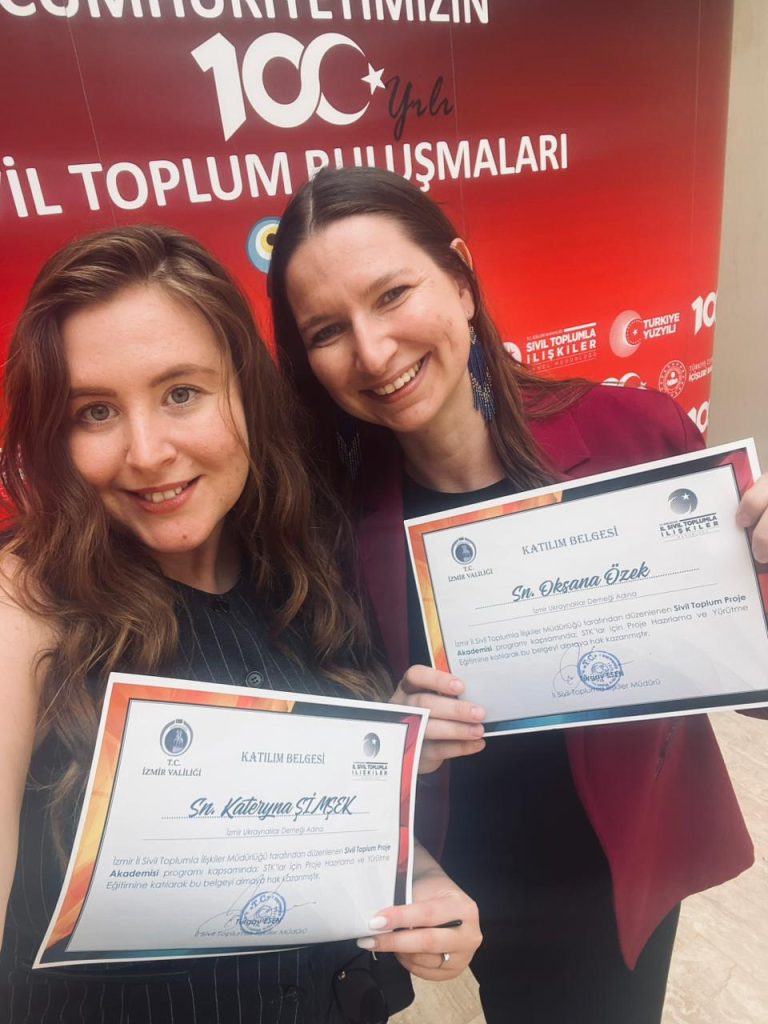 Члени Ради Правління “Об’єднання українців Ізміра” Оксана Озек та Катерина Довгалюк відвідали церемонію вручення сертифікатів про проходження навчання по програмі «Академія проєктів для громадянського суспільства» (Sivil Toplum Proje Akademisi), організованою Управлінням зв’язків з громадянським суспільством провінції Ізмір (İzmir İl Sivil Toplumla İlişkiler Müdürlüğü) та губернаторством провінції Ізмір (T.C. İzmir Valiliği).